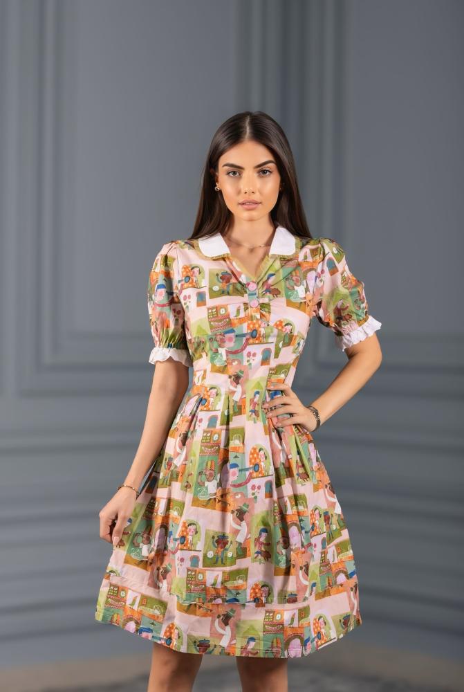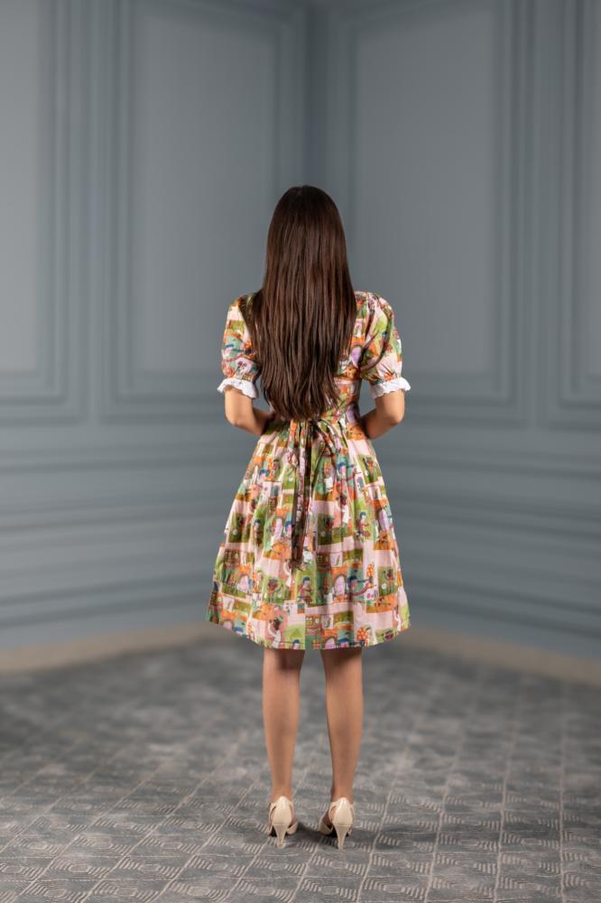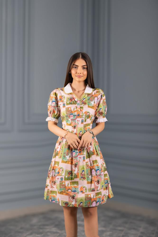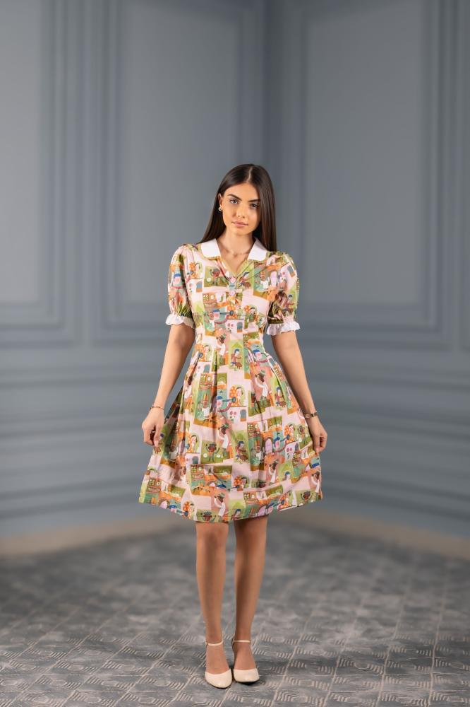 فستان أنيق كلاسيكي بطابع شبابي ، بتصميم ملوّن ورسومات مرحة