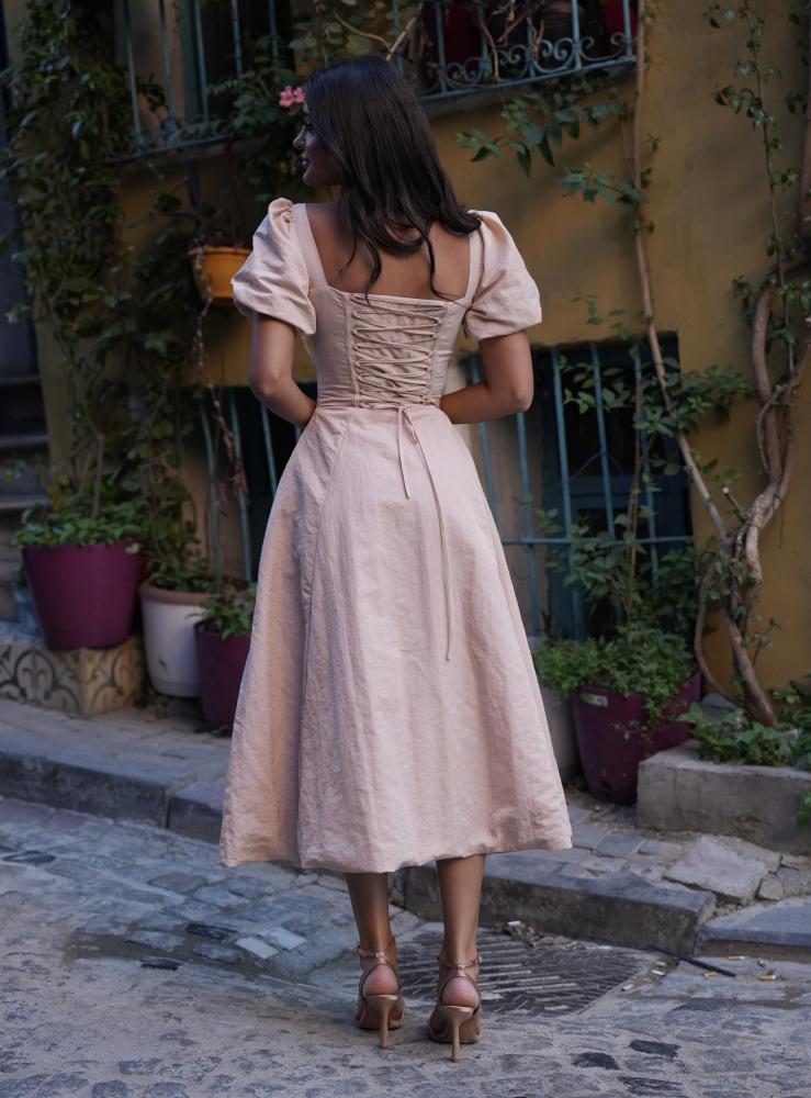 فستان طويل مع فتحة جانبية بخامة تفته الاسباني (ناعمة بشكل مجعد)