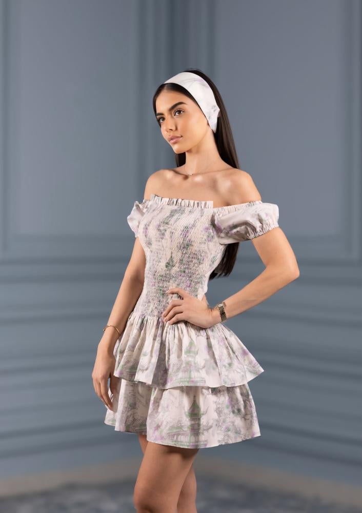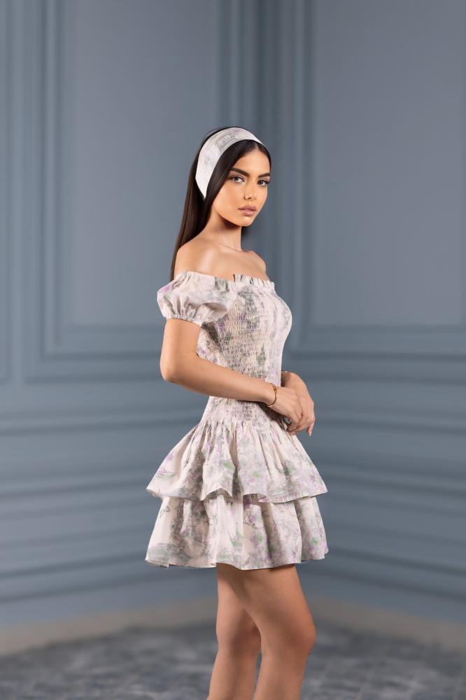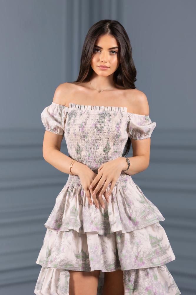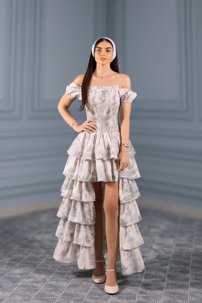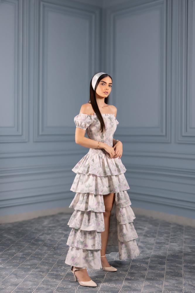 فستان قطعتين بسحاب خفي، الجزء العلوي مشدود يبرز الخصر، والجزء السفلي مزود بطبقات متدرجة تضيف حركة وأناقة